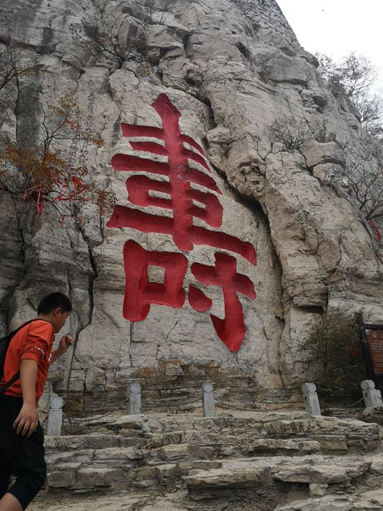 進(jìn)入山門,大家便三五成群沿著臺(tái)階拾級(jí)而上,沿途依次經(jīng)過(guò)觀壽亭、望壽閣道院、云門洞、“壽”字石刻。值得一提的是這個(gè)“壽”字石刻,此字高7.5米,僅其中的“寸”部就有兩米多高,如果你站在它下面,就應(yīng)了“人無(wú)寸高”。也因?yàn)樗篮玫脑⒁猓蠹壹娂娫诖肆粲啊?/span>